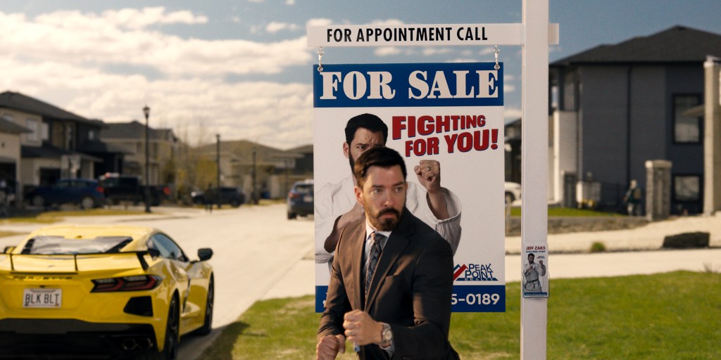 After borrowing his boss’ land-yacht of a Cadillac to get to a house showing, we see that Marvin’s current arch nemesis is Property Brother Drew Scott, playing neighboring Realtor Jeff Zaks. On his realty sign, we see that Jeff is posed in a Gi with a black belt, echoing Scott’s real-life second degree black belt skills. Those skills will come in handy a bit later in the film, so get your popcorn ready.