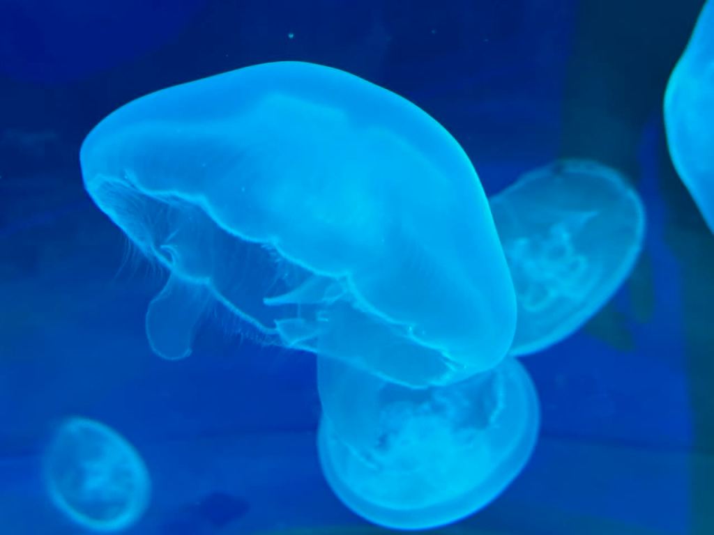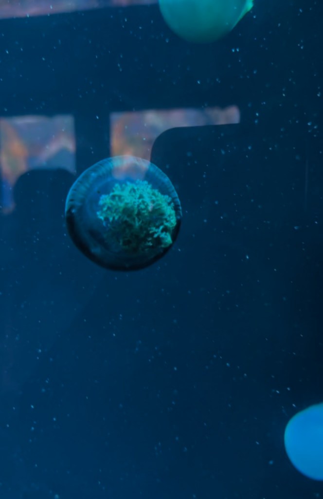 Moving on from that display, we are greeted with a hall of various moon jellies lit in soothing tones of blues, pinks and purple lighting… and tall column of moon jellies of various sizes showing how jellyfish migrate vertically rather than horizontally.